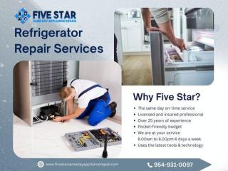 Looking for trusted refrigerator repair services? Five Star Same Day Appliance Repair offers fast, affordable fridge repair backed by over 25 years of experience. Our licensed and insured technicians provide same-day, on-time service using the latest tools and technology. We handle cooling issues, leaks, strange noises, and complete breakdowns. Available 6 days a week from 8:00 AM to 8:00 PM with budget-friendly pricing you can trust. Call today for professional fridge repair you can rely on.